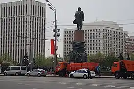 В августе 1991 года после провала Августовского путча в Москве демонстранты пытались снести памятник Ленину на Калужской площади. Несколько сотен человек пытались демонтировать Ленина, но им это не удалось. Памятник был слишком тяжелый, и сдвинуть его с места оказалось не по силам. Возможно также, что сносить его было небезопасно – внизу проходит автомобильный тоннель, и неосторожные действия могли привести к его обрушению. Прибывшие на место депутаты пообещали собравшимся, что решение по поводу сноса будет принято Моссоветом. Однако в итоге Ленин так и остался стоять на Калужской площади.