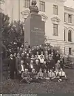 Группа студентов и преподавателей МГУ перед бюстом Ломоносову во дворе Аудиторного корпуса на Моховой улице. 1913 год.