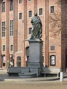 Памятник учёному планировался задолго до его возведения. В 1839 году несколько жителей Торуня инициировали его установку. Однако, несмотря на поддержку королей Пруссии Фридриха Вильгельма III и его сына Фридриха Вильгельма IV, воздвигнут памятник был лишь через 14 лет, его возведение обошлось в 10449 талеров.[2] Автор проекта, Кристиан Фридрих Тик, не дожил до установки два года.