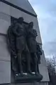 Перед центральным рельеф установлены скульптуры Петра Великого и Франца Лефорта. На постаменте выполнена надпись: «Петр I. Франсуа Лефорт». Оба деятеля имеют одинаковый рост (что соответствует историческим сведениям), изображены в стилизованном под парадные портреты XVIII века военном снаряжении с кортиками и развевающимися плащами за спинами. Франц (Франсуа - изначальный французский вариант его имени) Лефорт изображен с орденом и согнутой левой рукой.