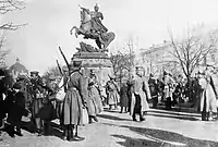 Русские солдаты у памятника Яну III Собескому во Львове во время Первой мировой войны. 1914 г.