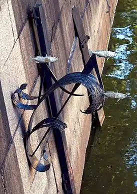 Микромонумент, укреплённый с внутренней стороны гранитного парапета канала, представляет трёх маленьких бронзовых рыбок на металлических волнах. На мемориальной доске — строки из стихотворения кронштадтской поэтессы Марии Аминовой «Блокадной колюшке»: