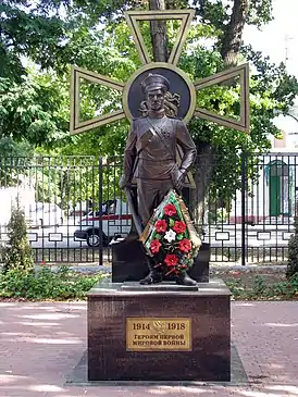 В городе Азове работа над памятником началась в 2012 году. Отливали памятник с февраля 2014 года. Памятник представляет собой фигуру стоящего казака, являющегося символом героических заслуг русских солдат, сзади него — Георгиевский крест. В правой руке казак держит саблю, в левой руке — ножны от сабли. Печальная поза казака соответствует итогами Первой мировой войны. Памятник установлен на гранитном постаменте. Скульптор — А. М. Дементьев.