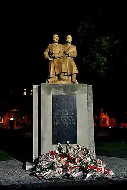 Памятный знак представляет две фигуры — советского и польского солдата, устремлëнных в атаку. На постаменте надпись: «Pamięci poległym w czasie II wojny światowej» («В память о погибших во время II мировой войны»).