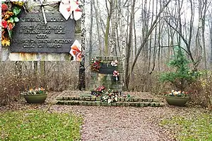 «Tu zostało straconych przez siepaczy hitlerowskich w styczniu 1940 roku 2000 najlepszych synów Ojczyzny. Cześć ich pamięci» (Здесь были расстреляны гитлеровскими приспешниками в январе 1940 года 2000 лучших сынов Отчизны. Честь их памяти».