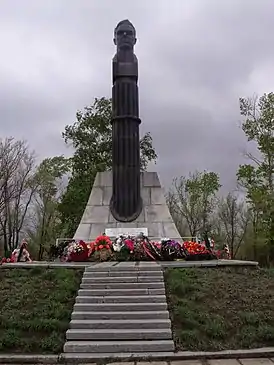 Первый памятник на месте гибели космонавта был установлен в 1967 году силами тринадцатой ракетной Оренбургской дивизии[5]. Он представлял собой стелу из сварного листового металла, на который был укреплён фотопортрет Комарова и выбито изображение женщины, держащей над рукой лепесток огня. Ниже находилась надпись: