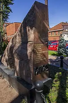 Памятник представляет собой треугольную стелу из красного гранита[3]. В верхнем углу треугольника расположен бронзовый медальон в виде перекрещенных серпа и молота, поверх которых расположена пятиконечная звезда[1].