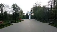 Памятник расположен в городском парке, в конце главной аллеи, на высоком берегу реки Истры.