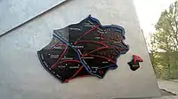 Карта, расположенная с левого края стелы, отображает основные контрудары Советских войск в битве за Москву и этапы освобождения Подмосковья в 1941—1942 годах.