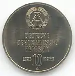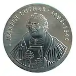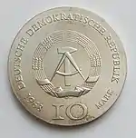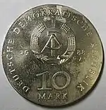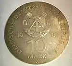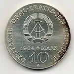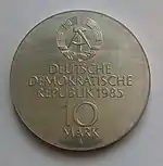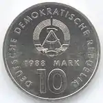 10.3.1983 | 9,6 | нейзильбер | 500 лет со дня рождения Лютера (на монете изображён домик в котором родился Лютер в Айслебене) | Хайнц Родевальд | 197 680[коммент. 30][44][43]* |