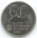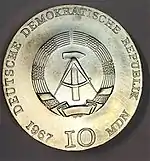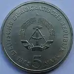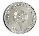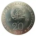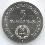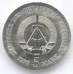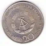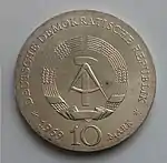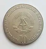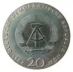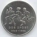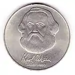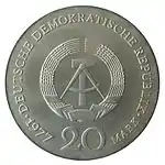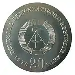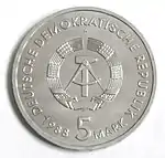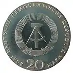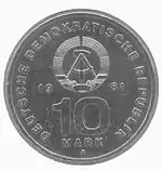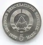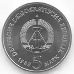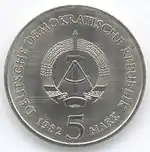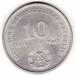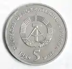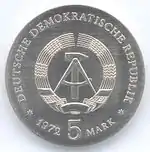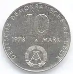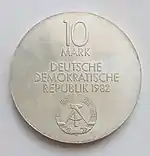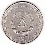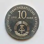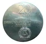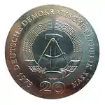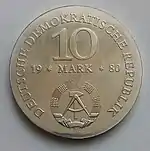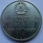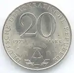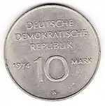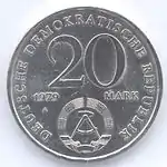 С 1968 по 1990 годы в ГДР выпускали памятные монеты номиналом в 5, 10 и 20 марок. 5-марочные монеты чеканились исключительно из нейзильбера, за исключением 5 марок 1969 года в честь 20-летия образования ГДР, в то время как 10 и 20 марок — как из серебра, так и из неблагородных металлов. Для них характерно единообразие размеров. Все 5-марочники имеют диаметр 29 мм, 10-марочники — 31 мм, 20-марочники — 33 мм[11]. Существуют несколько пробных золотых монет. Одна, посвящённая 150-летию со дня рождения Карла Маркса, хранится в Немецком историческом музее[12], 266 золотых 10-марочников в честь 40-летия победы над фашизмом в качестве пробных монет появились в 1985 году[13].
