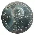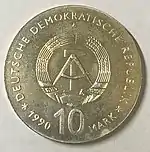 17.1.1983 | 9,6 | нейзильбер | 500 лет со дня рождения Лютера (на монете изображена замковая церковь Виттенберга на двери которой Лютер повесил 95 тезисов с чего началась Реформация) | Хайнц Родевальд | 196 500[коммент. 29][42][43]* |