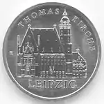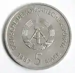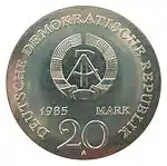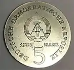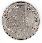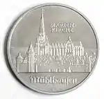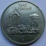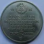 5.2.1985 | 9,6 | нейзильбер | 40 лет бомбардировке Дрездена. На монете изображены руины Фрауэнкирхе | Хайнц Родевальд | 195 000[коммент. 35][48][49]* |