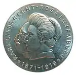 30.8.1967 | 17 | серебро 800-й пробы | 100-летие со дня рождения художницы, графика и скульптора Кете Кольвиц | Г. Роммель, А. Бертрам | 100 552[коммент. 54][68][67]* |