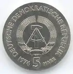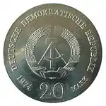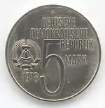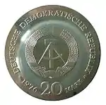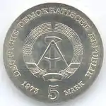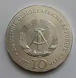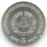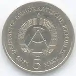 20.8.1974 | 17 | серебро 625-й пробы | 25-летие создания Германской Демократической Республики (на монете изображены известные здания на территории ГДР) | Г. Роммель, Д. Дорфштехер | 70 200[коммент. 64][79]** |