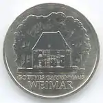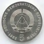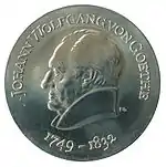 22.6.1982 | 9,6 | нейзильбер | 150 лет со дня смерти поэта и мыслителя Иоганна Вольфганга Гёте (на монете изображён домик в Веймаре, где Гёте проводил в уединении большую часть времени) | Хайнц Родевальд | 205 500[коммент. 27][40][37]* |