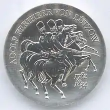 10.10.1984 | 12,2 | нейзильбер | 150 лет со дня смерти немецкого национального героя возглавившего партизанскую борьбу против войск Наполеона Адольфа фон Лютцова | Г. Роммель, Д. Дорфштехер | 45 000[коммент. 34][47][43]* |