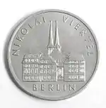 18.11.1981 | 12 | нейзильбер | 700-летие начала чеканки монет в Берлине. На монете изображён «вечный пфенниг» 1369 года, как самая старая из сохранившихся берлинских монет | Хайнц Родевальд | 54 540[коммент. 77][88]*** |