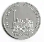 15.2.1988 | 9,6 | нейзильбер | Первый немецкий паровоз «Саксония» (Выпуск приурочен к 150-летию первой железной дороги в Германии) | Вилфрид Клинк, Беттина Клинк фон Войски | 366 800[коммент. 44][58][56]** |