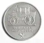 15.2.1990 | 9,6 | нейзильбер | Почтовая карета (Выпуск приурочен к 500-летию почты Германии) | Вилфрид Клинк, Беттина Клинк фон Войски | 366 320[коммент. 50][63][61]* |