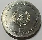 В 1990 году произошло объединение Германии. Оно не было равноправным объединением двух стран. Территории ГДР и Западного Берлина присоединялись к ФРГ, а на их территориях начинала действовать конституция ФРГ. Валюта Германской Демократической Республики прекращала являться законным платёжным средством с 1 июля 1991 года[8] и подлежала обмену, а затем уничтожению. Уничтожение монет состояло в их переплавке с последующим использованием полученного металла в промышленности. Согласно предположению руководителя архивом государственного KfW банка Лизанны Гольдбах, детали автомобилей этих годов выпуска сделаны из монет ГДР[9][10].