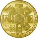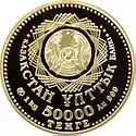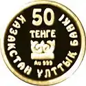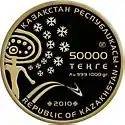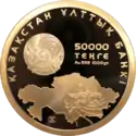 - С аналогичным дизайном были выпущены серебряные монеты номиналом 500 и 5000 тенге и медно-никелевая монета номиналом 50 тенге