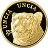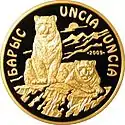 | Аверс: герб Казахстана на фоне национального орнамента, название банка-эмитента на каз. ҚАЗАҚСТАН ҰЛТТЫҚ БАНКІ, номинал, масса и проба металла, знак монетного двора. Реверс: пара ирбисов на фоне гор, названия животного на каз. БАРЫС и лат. UNCIA UNCIA, год чеканки монеты. Гурт рубчатый. Номинал: 500 тенге[22]. Масса: 31,1 г. Диаметр: 32 мм. Тираж: 1500 шт.[17] | ||