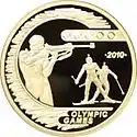 | Аверс: герб Казахстана на фоне стилизованного изображения стадиона, название государства на англ. REPUBLIС OF KAZAKHSTAN, номинал, логотип НБРК, масса и проба металла, год чеканки монеты. Реверс: сцена биатлона, изображение пяти мишеней, на месте трёх из которых — вставки из 3 бриллиантов диаметром до 1 мм каждый, надпись «Олимпийские игры 2010» на англ. OLYMPIC GAMES 2010. Гурт рубчатый. Номинал: 500 тенге[18]. Масса: 7,78 г. Диаметр: 25 мм. Тираж: 5000 шт.[17] | ||