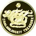 | Аверс: национальный орнамент, название банка-эмитента на каз. ҚАЗАҚСТАН ҰЛТТЫҚ БАНКІ, номинал, проба металла. Реверс: изображение изделия в виде оленя, спираль, название монеты на англ. ZHALAULINSKIY TREASURE, год выпуска. Гурт рубчатый. Номинал: 50 тенге. Масса: 0,5 г. Диаметр: 11 мм[8]. Тираж: 14 000 шт. | ||