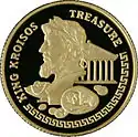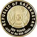 | Аверс: герб Казахстана, название государства на англ. REPUBLIC OF KAZAKHSTAN, номинал, год выпуска, масса[3] и проба металла. Реверс: профиль царя Крёза на фоне древних монет и древнегреческого храма, геометрический орнамент, название монеты на англ. KING KROISOS TREASURE. Гурт рубчатый. Номинал: 100 тенге. Масса: 1,24 г. Диаметр: 13,92 мм. Тираж: 5000 шт.[5] | ||