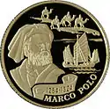 | Аверс: герб Казахстана, название государства на англ. REPUBLIC OF KAZAKHSTAN, номинал, год выпуска, масса[3] и проба металла. Реверс: портрет путешественника на фоне каравана верблюдов и корабля, его имя на англ. MARCO POLO и годы жизни (1254—1324). Гурт рубчатый. Номинал: 100 тенге. Масса: 1,24 г. Диаметр: 13,92 мм. Тираж: 20 000 шт.[6] | ||