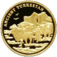 | Аверс: герб Казахстана, название государства на англ. REPUBLIC OF KAZAKHSTAN, номинал, год выпуска, масса[3] и проба металла. Реверс: караван верблюдов на фоне мавзолея Ходжи Ахмеда Ясави, название монеты на англ. ANCIENT TURKESTAN. Гурт рубчатый. Номинал: 100 тенге. Масса: 1,24 г. Диаметр: 13,92 мм. Тираж: 15 000 шт.[7] | ||