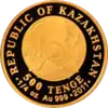 | Аверс: название банка-эмитента на каз. ҚАЗАҚСТАН ҰЛТТЫҚ БАНКІ, номинал, масса и проба металла, национальный орнамент. Реверс: герб Казахстана, окружённый изображениями различных банкнот национальной валюты, орнамент из символов тенге, надпись на каз. ТЕҢГЕГЕ 20 ЖЫЛ — «20 лет тенге», год выпуска. Гурт рубчатый. Номинал: 100 000 тенге[26]. Масса: 2000 г. Диаметр: 100 мм. Тираж: 60 шт.[21] |