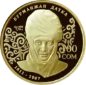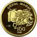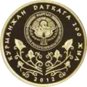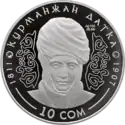 | Аверс: государственный герб, растительный орнамент, надпись на кирг. КУРМАНЖАН ДАТКАГА 200 ЖЫЛ, год выпуска монеты. Реверс: портрет, имя и годы жизни правительницы на фоне национального орнамента, номинал, масса и проба металла. Номинал: 100 сомов. Материал: золото-999. Масса: 7,78 г. Диаметр: 22,6 мм. Отчеканена на Литовском монетном дворе. | ||