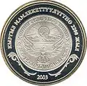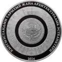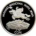 | Аверс: герб Киргизии в обрамлении национального орнамента, название серии на кирг. КЫРГЫЗСТАНДЫН ТАРЫХЫЙ ЖАНА АРХИТЕКТУРАЛЫК ЭСТЕЛИКТЕРИ, год чеканки. Реверс: изображение мавзолея, его название на кирг. МАНАСТЫН КҮМБӨЗҮ и на англ. KUMBEZ OF MANAS, манасчи, конь, летящий сокол, национальный орнамент и номинал. |