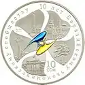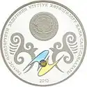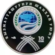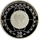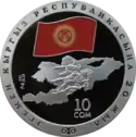 | Аверс: государственный герб на фоне стилизованного цветка с лепестками, исчерченными меридианами и параллелями, надпись на кирг. Евразия экономикалык шериктештигине 10 жыл и год выпуска монеты. Реверс: эмблема ЕврАзЭС на фоне стилизованного цветка, на лепестках которого изображены достопримечательности столиц стран-членов сообщества, номинал, проба и масса металла, надпись на рус. 10 лет Евразийскому экономическому сообществу. Тираж: 2000 шт. Отчеканена на Казахстанском монетном дворе. | ||