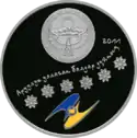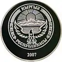 | Аверс: государственный герб на фоне стилизованного Земного шара, надпись на кирг. ЕВРАЗЭС ӨЛКӨЛӨРҮНҮН БОРБОРЛОРУ, национальный орнамент и год выпуска монеты. Реверс: конная статуя Манаса, здания Бишкека, эмблема ЕврАзЭС, название города, номинал, проба и масса металла, надпись на рус. СТОЛИЦЫ СТРАН ЕВРАЗЭС. Тираж: 2500 шт. Отчеканена на Казахстанском монетном дворе. | ||
