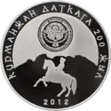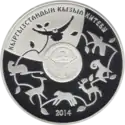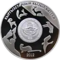 | Аверс: государственный герб, стилизованные изображения девушки и парня, скачущих верхом на лошади, и людей, наблюдающих за состязанием, надпись на кирг. Улуттук спорт жана элдик оюндары, год выпуска монеты. Реверс: изображение всадника, догоняющего свою спутницу, на фоне гор, название игры на кирг. КЫЗ КУУМАЙ, номинал, масса и проба металла. Масса: 28,28 г. Диаметр: 38,60 мм. Тираж: 2000 шт. Отчеканена [уточнить]. | ||
