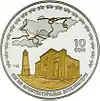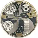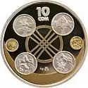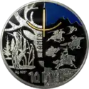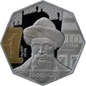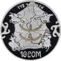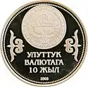 | Аверс: государственный герб, надпись на кирг. УЛУТТУК ВАЛЮТАГА 10 ЖЫЛ, год выпуска монеты, национальный орнамент и окантовка из точек. Реверс: изображения двух золотых[4] и четырёх серебряных[5] монет на фоне тундука, номинал, проба и масса металла. Масса: 28,28 г. Диаметр: 38,60 мм. Тираж: 1000 шт. Отчеканена на Кремницком монетном дворе. | ||