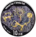 | Аверс: государственный герб, изображение петроглифов, название серии на кирг. КЫРГЫЗСТАНДЫН ТАРЫХЫЙ ЖАНА АРХИТЕКТУРАЛЫК ЭСТЕЛИКТЕРИ, год выпуска монеты. Реверс: петроглифы из урочища Саймалуу-Таш, его название на кирг. Саймалуу-Таш и англ. Saimaluu-Tash, номинал, масса и проба металла. | ||