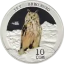 | Аверс: государственный герб, окружённый стилизованными изображениями различных животных, название серии на кирг. КЫРГЫЗСТАНДЫН КЫЗЫЛ КИТЕБИ и год выпуска. Реверс: изображение филина на фоне гор, название животного на кирг. ҮКҮ и лат. BUBO BUBO, номинал, масса и проба металла. Тираж: 3000 шт. Отчеканена на Кремницком монетном дворе. | ||