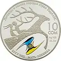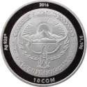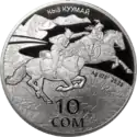 Монеты номиналом 10 сомов массой 31,1 г и диаметром 38,60 мм изготовлены из серебра 925 пробы в качестве proof.