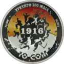 | Аверс: государственный герб, национальный орнамент, дата «2016». Реверс: символическая сцена из антицарского восстания, дата «1916», надпись на кирг. ҮРКҮНГӨ 100 ЖЫЛ — 100 лет восстания, номинал, масса и проба металла. Масса: 28,28 г. Диаметр: 38,61 мм. Тираж: 1000 шт. Отчеканена [уточнить]. | ||