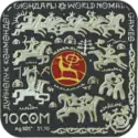 | Аверс: государственный герб на фоне юрты, год выпуска монеты, национальный орнамент. Реверс: логотип игр тампопечатью, стилизованные фигуры кочевников, название игр на кирг. ДҮЙНӨЛҮК КӨЧМӨНДӨР ОЮНДАРЫ и англ. WORLD NOMAD GAMES, номинал, масса и проба металла. Масса: 31,10 г. Размеры: 38,61×38,61 мм. Тираж: 1000 шт. Отчеканена [уточнить]. | ||
