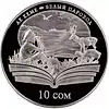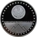 Аверс: сцена произведения на фоне раскрытой книги, его название на киргизском и русском языках, номинал, проба и масса металла.