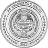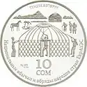 | Аверс: государственный герб, эмблема ЕврАзЭС и национальный орнамент, надпись на кирг. ЕврАзЭС ӨЛКӨЛӨРҮНҮН ЭЛДЕРИНИН УЛУТТУК ЖӨЛӨРГӨЛӨРҮ ЖАНА САЛТ-САНААЛАРЫ и год выпуска. Реверс: сцена возведения юрты, номинал, проба и масса металла, надпись на кирг. ТҮНДҮК КӨТӨРҮҮ и на рус. Национальные обычаи и обряды народов стран ЕврАзЭС. Тираж: 3000 шт. Отчеканена на Казахстанском монетном дворе. | ||