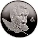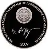 | Аверс: портрет писателя, его имя на кирг. Чыңгыз Айтматов, перо, номинал, проба и масса металла. Реверс: герб Киргизии, летящие журавли на фоне гор, год выпуска монеты. |