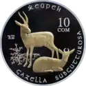 | Аверс: государственный герб, окружённый стилизованными изображениями различных животных, название серии на кирг. КЫРГЫЗСТАНДЫН КЫЗЫЛ КИТЕБИ и год выпуска. Реверс: пара джейранов на фоне кустарника, название животного на кирг. Жейрен и лат. Gazella subgutturosa, номинал, масса и проба металла. Тираж: 3000 шт. Отчеканена на Литовском монетном дворе. | ||