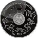 | Аверс: государственный герб и узор из стилизованных оленьих рогов, надпись на кирг. ЕВРАЗЭС ӨЛКӨЛӨРҮНҮН ЭЛДЕРИНИН УЛАМЫШТАРЫ ЖАНА ЖОМОКТОРУ и год выпуска монеты. Реверс: сцена из легенды о матери-оленихе из повести Ч. Айтматова «Белый пароход» и эмблема ЕврАзЭС, номинал, проба и масса металла, надпись на рус. Легенды и сказки народов стран ЕврАзЭС, кирг. БУГУЭНЕ и рус. МАТЬ-ОЛЕНИХА. Тираж: 3000 шт. Отчеканена на Казахстанском монетном дворе. | ||