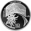 | Аверс: государственный герб, надпись на кирг. ЭГЕМЕН КЫРГЫЗ РЕСПУБЛИКАСЫНА 10 ЖЫЛ, год выпуска монеты, национальный орнамент. Реверс: изображение пика Хан-Тенгри, название горы на кирг. ХАН-ТЕҢИРИ, номинал, проба и масса металла. Масса: 28,28 г. Диаметр: 38,60 мм. Тираж: 1000 шт. Отчеканена на Польском монетном дворе. | ||